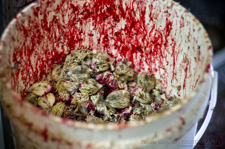 The sweetest little birds who had spent their short lives in a poo filled pen have their heads cut off with scissors. This is the bucket their heads get thrown in. Their headless bodies are thrown in to a bucket next to this one where their bodies flail around for about a minute after decapitation. I stood there and watched whilst little headless bodies of quail jumped out of the bucket and flapped around on the floor.