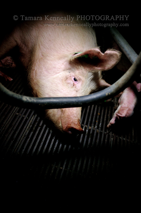 Trapped in a farrowing crate in an intensive piggery, after ten minutes of fear,  she finally looked me in the eyes