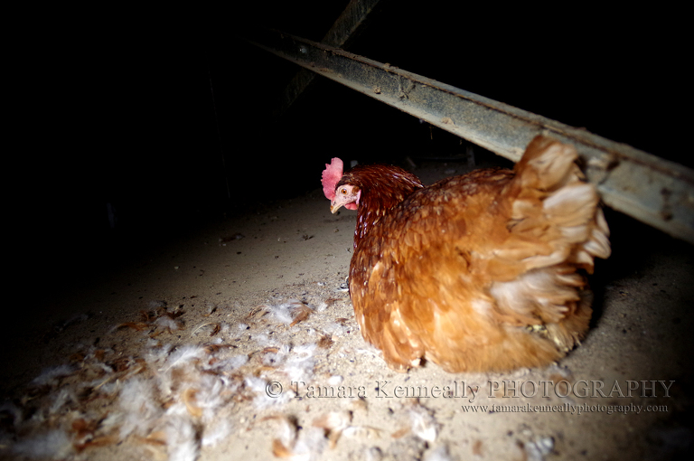 Here she sat. Unable to move. Starved for a week or more. Weak and dehydrated. The free range egg shed she lived in was cleared out a week ago. All her friends were sent to slaughter because they were no longer producing enough eggs at 18 months of age. She evaded being caught. The shed door was left wide open and foxes came in every night and took her remaining friends. In this image, you can see the feathers of her friend taken by a fox not long ago.
